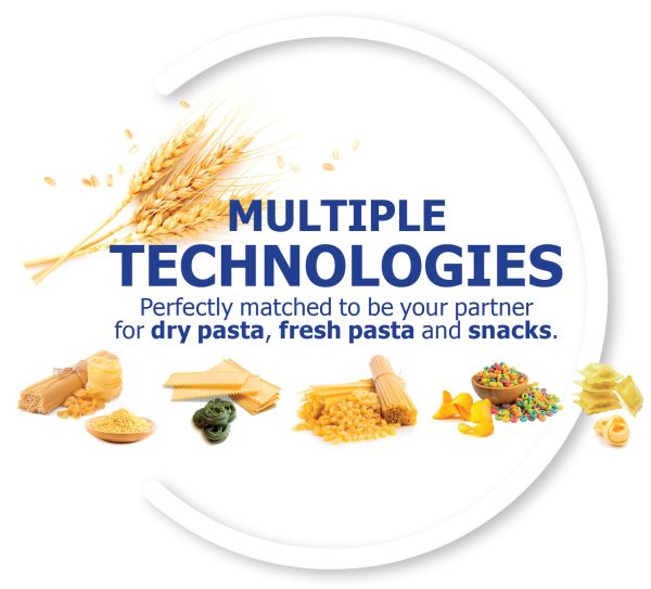 Complete lines for the production of filled and sheeted fresh pasta, as well as systems for the production of snack pellets, breakfast cereals, instant flours and expanded products.